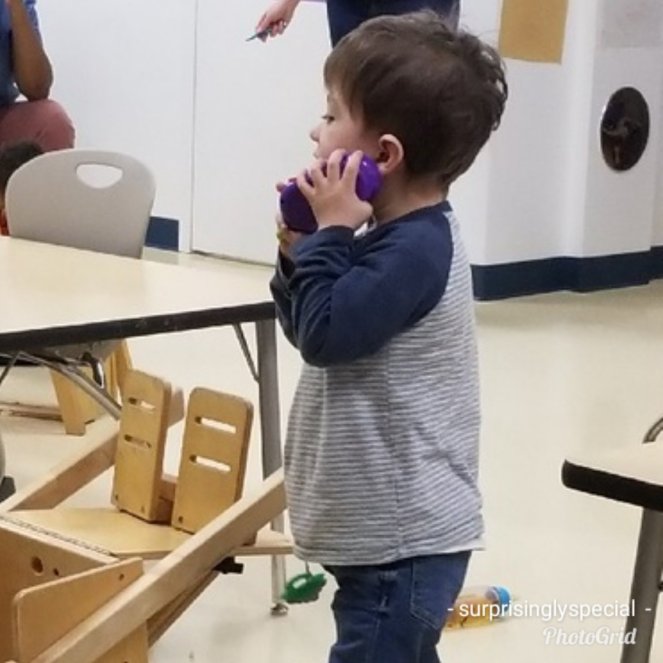 Not only is he vocalizing more, but he is engaging in vocal back and forth “conversations” with adults and peers and even on a toy phone, LOL. So cute! But not only is it cute, it means that he is starting to understand the back-and-forth exchange of conversation and communication.