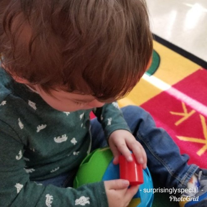 Henry has been doing really well with putting items into containers. In his classroom his teacher and therapist use shape sorters where he has to fit different types of shapes into the right holes. And he’s doing pretty well with most of them! There’s one with buttons where he has to get the button aligned with the slot just right, and he can do that one with help but often gets frustrated and throws the buttons instead… Putting items into a container is an important skill because it translates to the self-care skill of being able to clean up and put things away! The only problem is Henry sometimes likes to put things into containers a little too much… He has been known to put things in the garbage can that are definitely not supposed to be there! This happens both at home and at school!