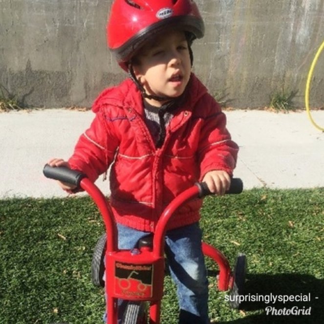 At home, we have just got on Henry a new kind of bike. It’s a balance bike with training wheels added on, which I know seems weird, but our thinking was that since he could not yet use pedals, he could propel himself with his feet on a balance bike… but a balance bike on its own was too wobbly for his level of strength and stability. So we had the training wheels added on which makes it sort of a bigger version of those little four wheeled scoot-along cars for babies. He can sit on it and use his feet on the ground to push himself along. It’s working pretty well. But his physical therapist actually has him working on using pedals on a tricycle that has foot plates with straps where his feet can be strapped in! I’m excited that he is working on different ways to use a riding toy.